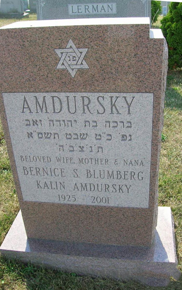 Blumberg, Robert Robert BlumbergBorn 1921Died 1955 Burial LocationArea:Section:JBlock:Row:Plot:50Subplot:A SpouseBernice (Kalin) AmdurskyBorn 1924 in Syracuse, NYDied 2/25/2001 in Syracuse, NY