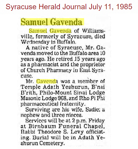 Gavenda, Samuel Samuel GavendaDied 7/10/1985 in Buffalo, NY Burial LocationArea:Section:OBlock:Row:Plot:42Subplot:B SpouseSadie Gavenda