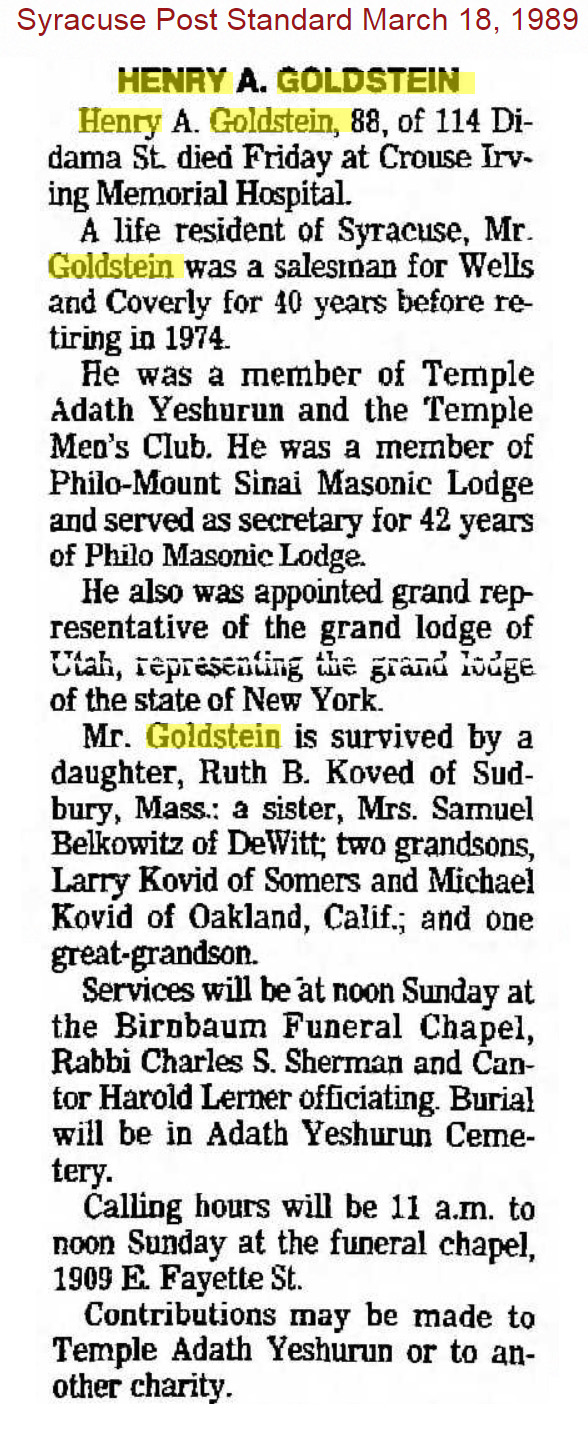 Died 3/17/1989 in Syracuse, NY