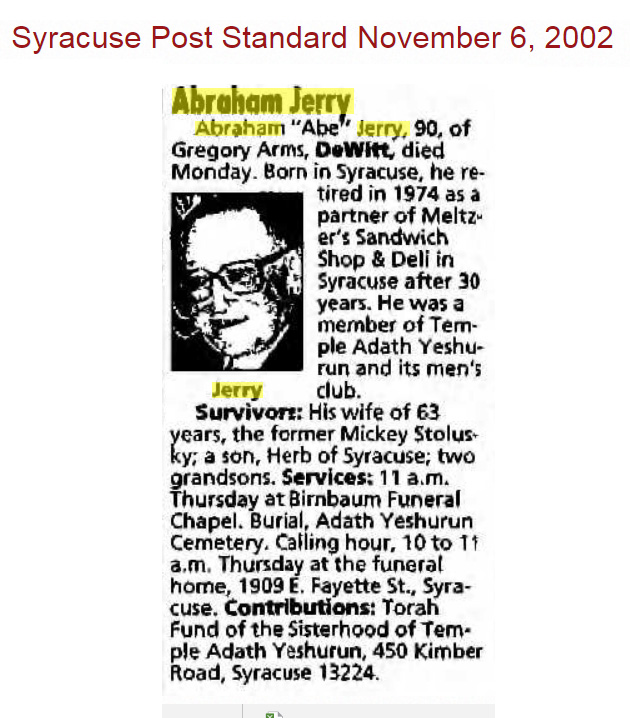 Jerry, Abraham Abraham "Abe" JerryBorn 1913 in Syracuse, NYDied 2002 Burial LocationArea:Section:LBlock:Row:Plot:2Subplot:A SpouseMolly "Mickey" (Stolusky) JerryBorn 3/16/1916Died 10/7/2011 in Syracuse, NY