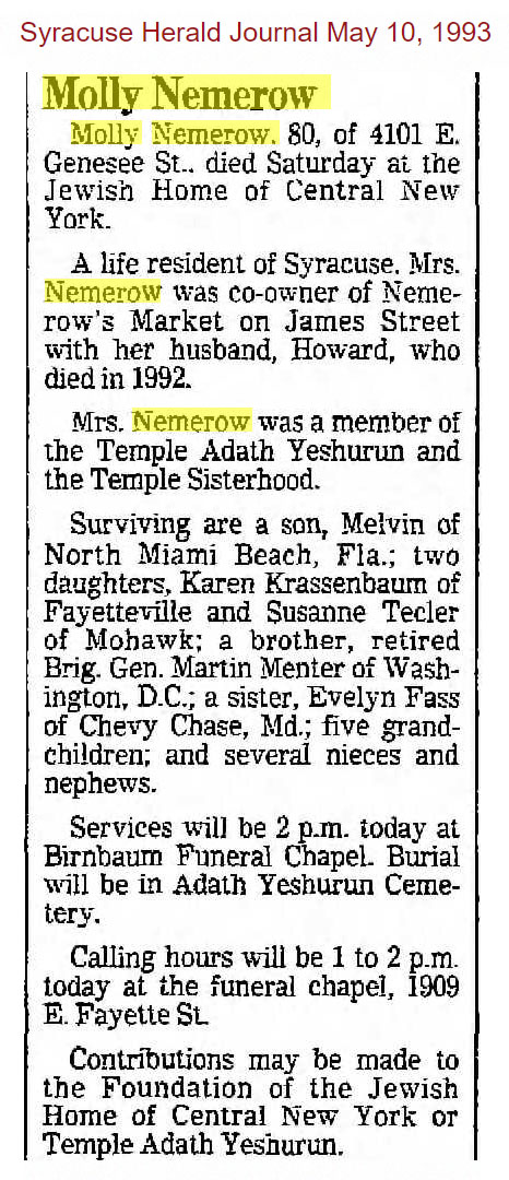 Nemerow, Mollie Molly NemerowBorn 1913Died 5/9/1993 Burial LocationArea:Section:KBlock:Row:Plot:35Subplot:A SpouseHoward NemerowBorn 1913Died 1992 in Syracuse, NY
