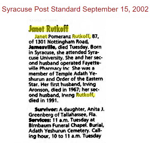 Rutkoff, Janet Janet (Pomeranz) RutkoffBorn 1915Died 2002 in Syracuse`, NY Burial LocationArea:Section:PBlock:Row:Plot:51Subplot:C SpouseIrving L RutkoffBorn 1911 in Russia RUDied 9/2/1991 in Syracuse, NY