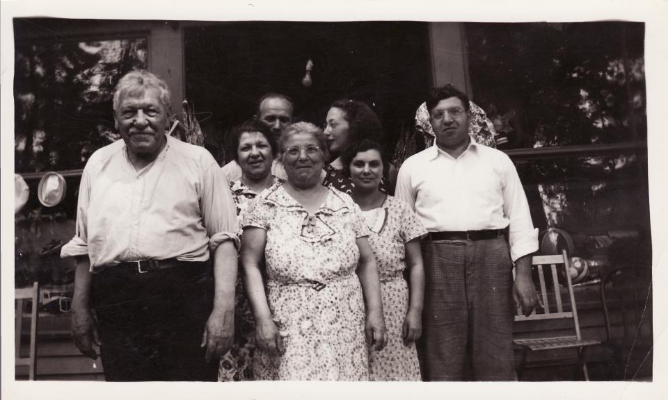 Louis and Ida Serby\'s Sylvan Beach store. L to R: Louis Serby, Freda Serby Blumkin, Joseph Blumkin, Ida Sobey Serby, Sylvia Blumkin Brownstein, Rebecca Glass Serby, and Victor Serby.