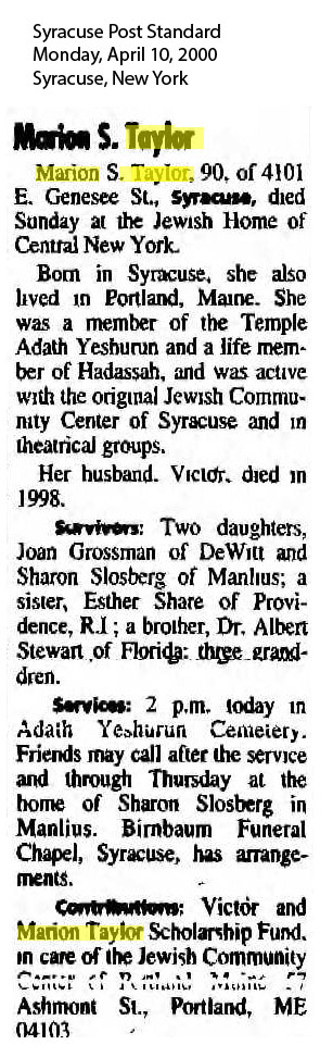 Taylor, Marion Marion (Stewart) TaylorBorn 1910Died 2000 Burial LocationArea:Section:KBlock:Row:Plot:32Subplot:A SpouseVictor H TaylorBorn 1909 in Utica, NYDied 2/6/1998 in Syracuse, NY