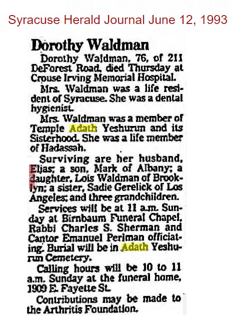 Waldman, Dorothy Dorothy WaldmanBorn 1920 in New York City, NYDied 6/11/1993 in Syracuse, NY. Dorothy Waldman died in 1993. Survived by husband Elias Waldman, son, Mark Waldman; daughter, Lois (Seth Goodchild) Waldman; grandchildren: Allie, Sam and Justin Goodchild; Burial LocationArea:Section:NKBlock:Row:Plot:29Subplot: SpouseElias Waldman Veteran Born 1920 in New York City, NYDied 12/23/2005 in Syracuse, NY